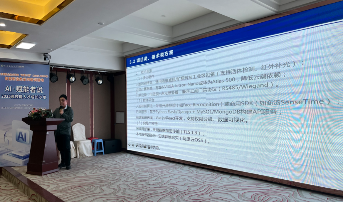 作为三场培训的核心技术环节,我校电子信息学院丁度坤教授受邀担任了专题讲座的主讲人。他以“AI技术赋能智能制造实践应用”为核心主题,为在场学员打造了一场兼具理论深度与实操价值的技术盛宴。