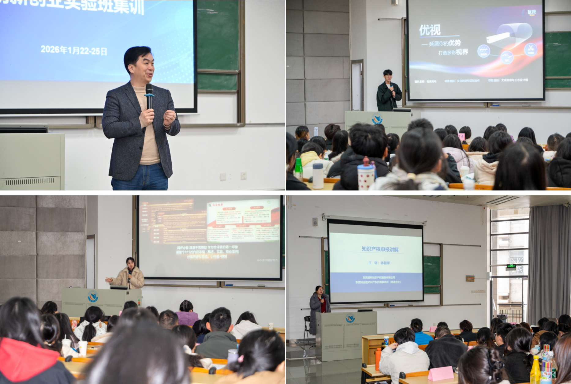 开幕式后,学员们立即投入到为期四天、内容充实的集训中。课程体系围绕“理论-案例-工具-实战”的逻辑闭环精心设计。首日(奠基与洞察),重点构建系统思维,学习了《创业团队创建》《AI时代共创能力培养》及《创业大赛开发模型》;次日(经验与商机),聚焦实战经验,邀请了2025年国赛金奖团队进行路演分享与经验复盘,并深入学习了《知识产权申报》与《创赛项目商机分析》;第三日(产品与赋能),深化项目核心能力,课程涵盖《创赛项目产品设计与创新》,并引入前沿的《AI赋能创业计划书设计》实战操作;第四日(闭环与检验),完成商业逻辑构建与学习成果验收,上午学习《商业模式设计》与《创业计划书逻辑》,下午则通过紧张激烈的“创业路演对抗赛”进行综合演练与结业考核。