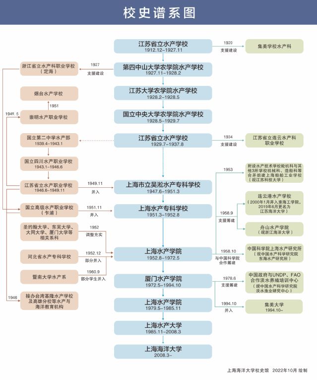 1927年,学校更名为第四中山大学农学院水产学校,1928年更名为国立中央大学农学院水产学校,1929年恢复江苏省立水产学校校名。1937年因八一三事变,校舍毁于战火,辗转合川维续水产教育。1939年先于国立第二中学成立水产部,后于1943年成立国立四川水产职业学校。1947年在上海复校,定名为上海市立吴淞水产专科学校,1951年更名为上海水产专科学校,1952年组建升格为上海水产学院,成为中国第一所独立建制的本科水产高等学府。1972年受十年浩劫影响搬迁到厦门集美办学,更名为厦门水产学院,1979年迁回上海原址恢复上海水产学院,同时保留厦门水产学院。1985年更名为上海水产大学。2008年为适应国家海洋事业发展需要,更名为上海海洋大学。